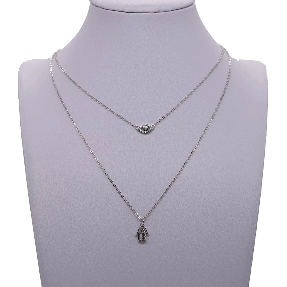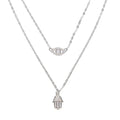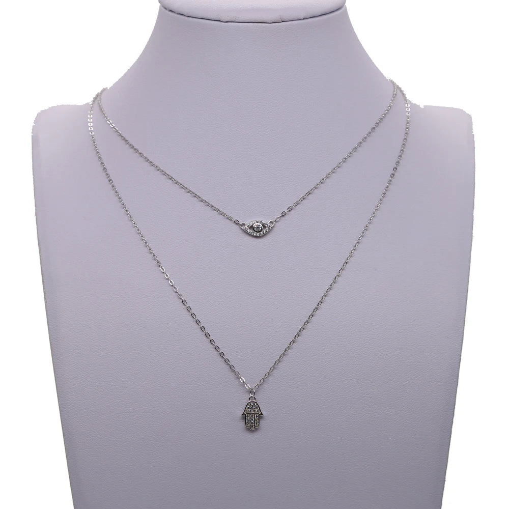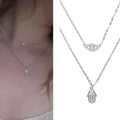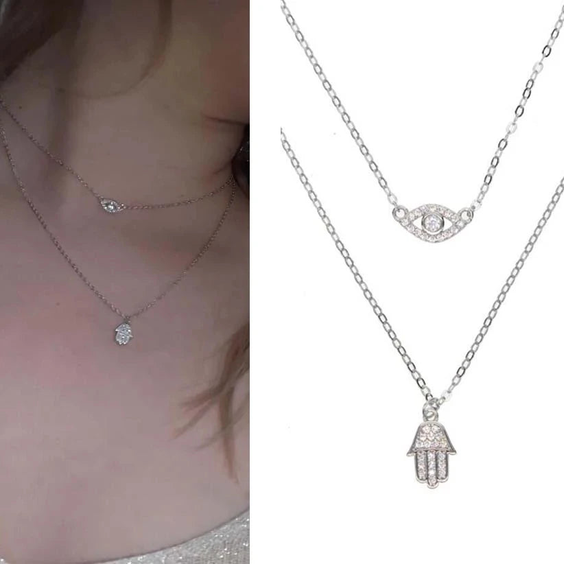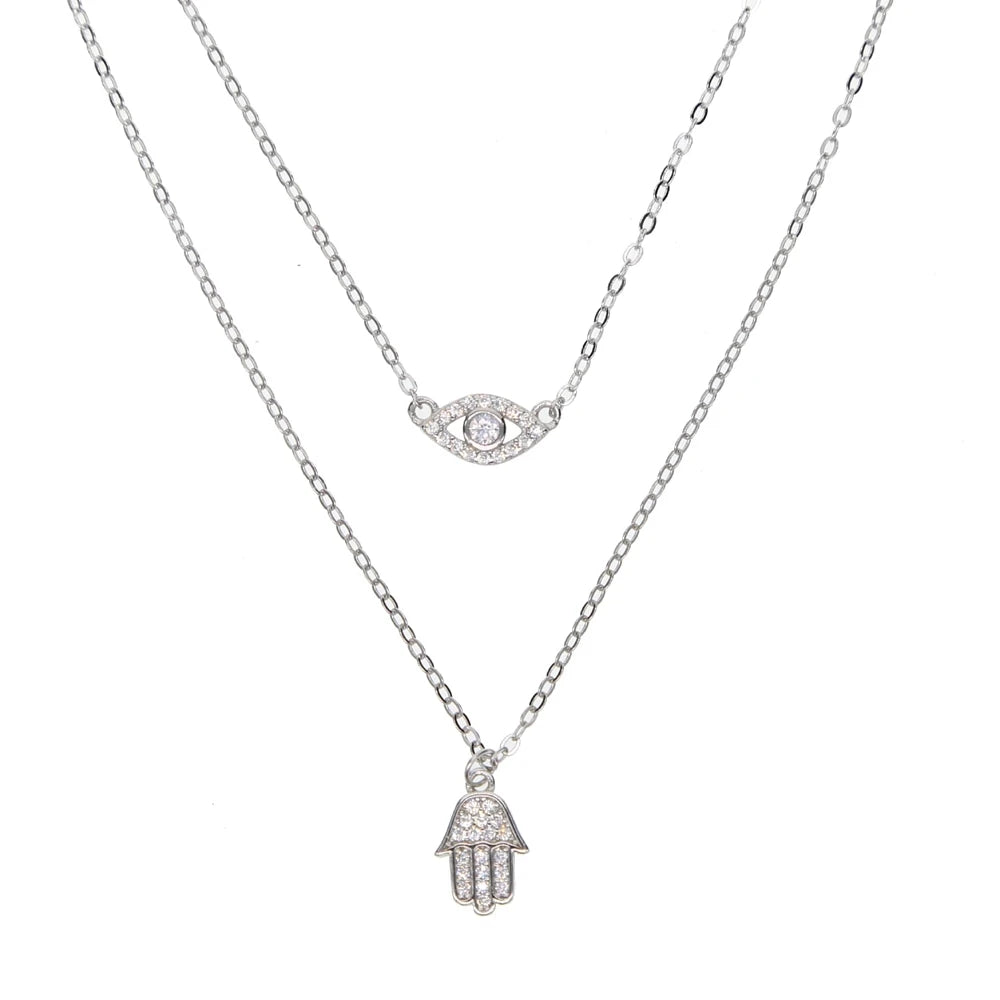 New Sexy Women Jewelry Lucky Hamsa Hand Evil Eye Cham Drop Silver Color Paved Cz Jewelry Double Layer Necklace Real 925 Silver